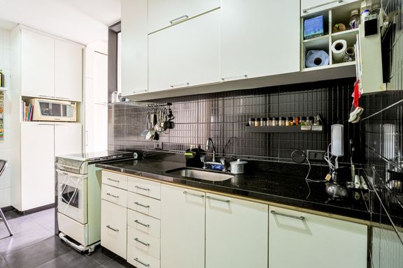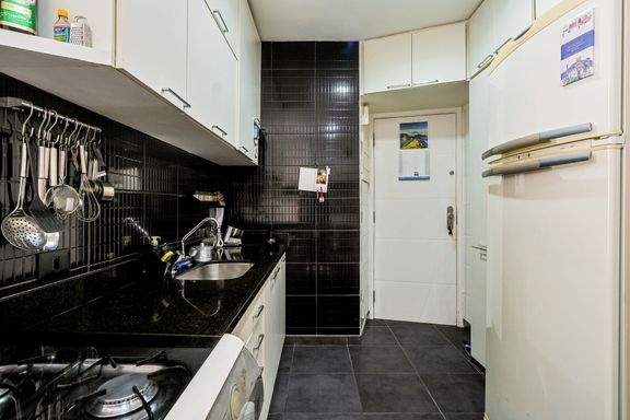 A cozinha funcional é integrada à área de serviço, tudo com acabamento refinado.
